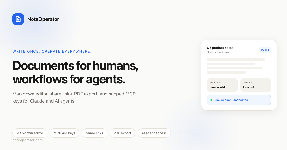 Write Markdown, share documents with one link, export to PDF, and connect Claude or any AI agent via scoped MCP API keys